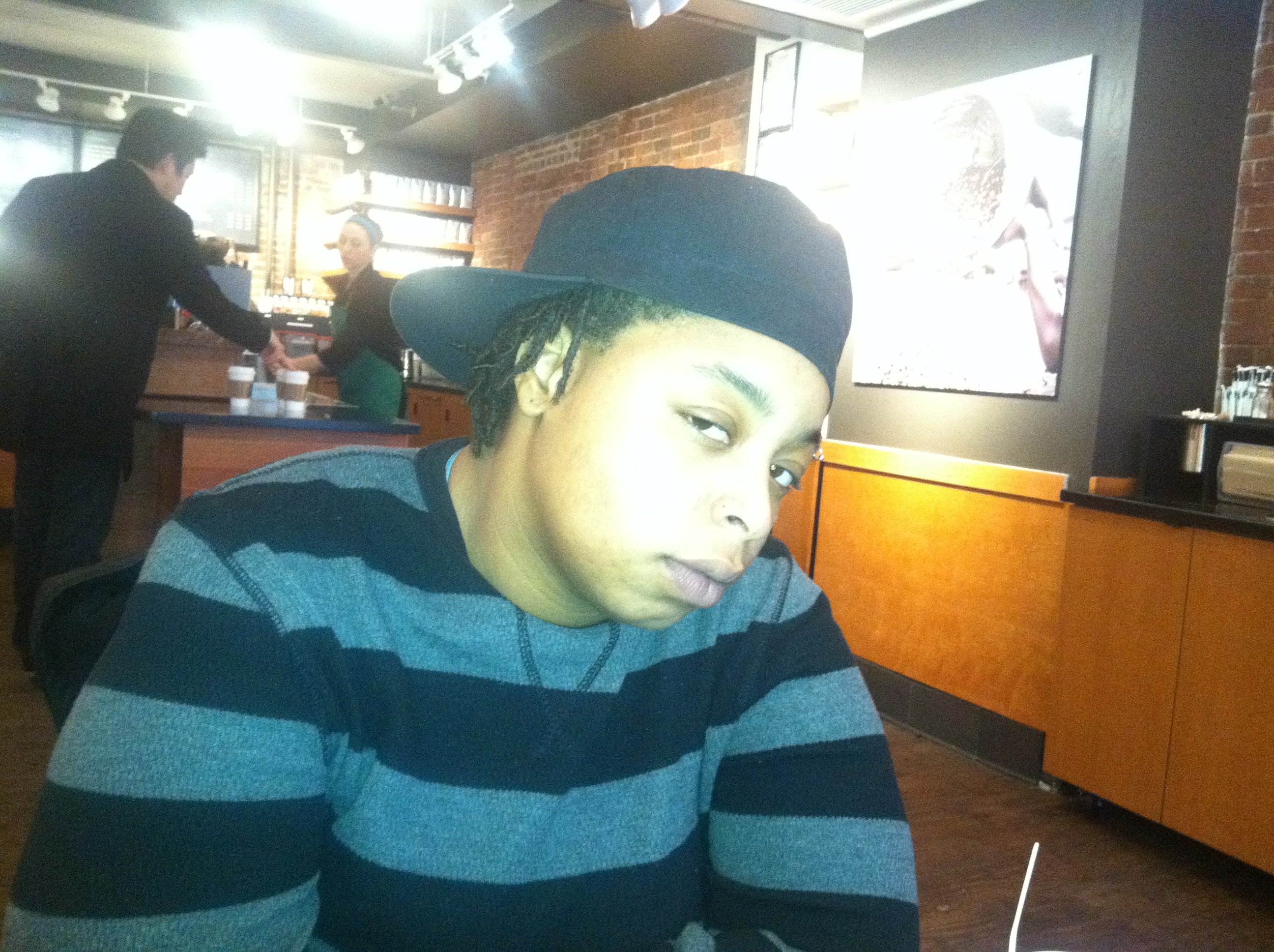 Diamond McMillion mugs for the camera at a Harvard Square cafe before heading to work in the kitchen at